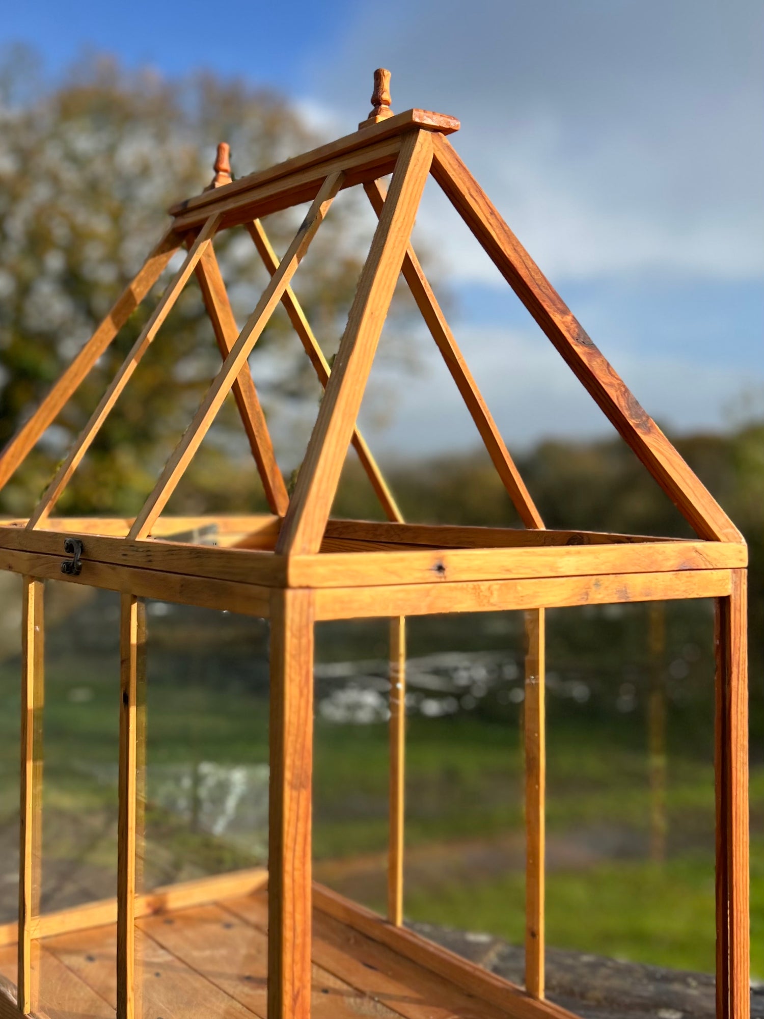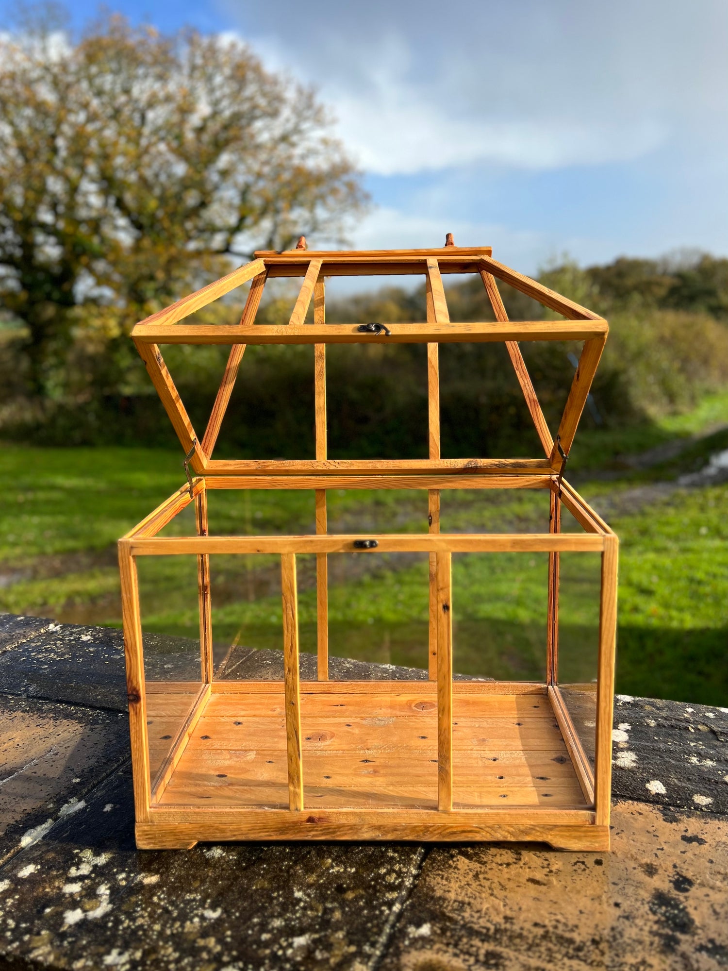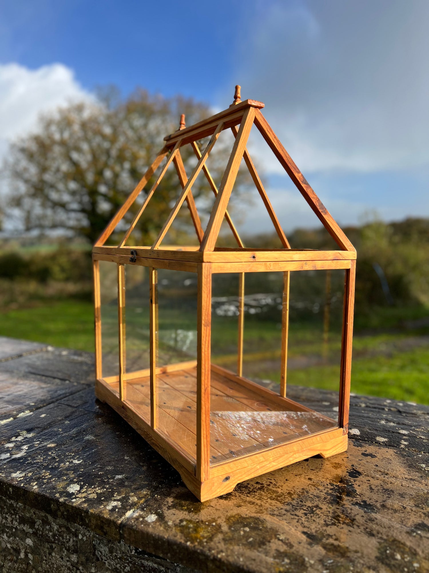 Made from recycled wood this handcrafted terrarium has glass on all four sides and a hinged open gable roof, allowing plants to climb around the truces while still being easy to water.